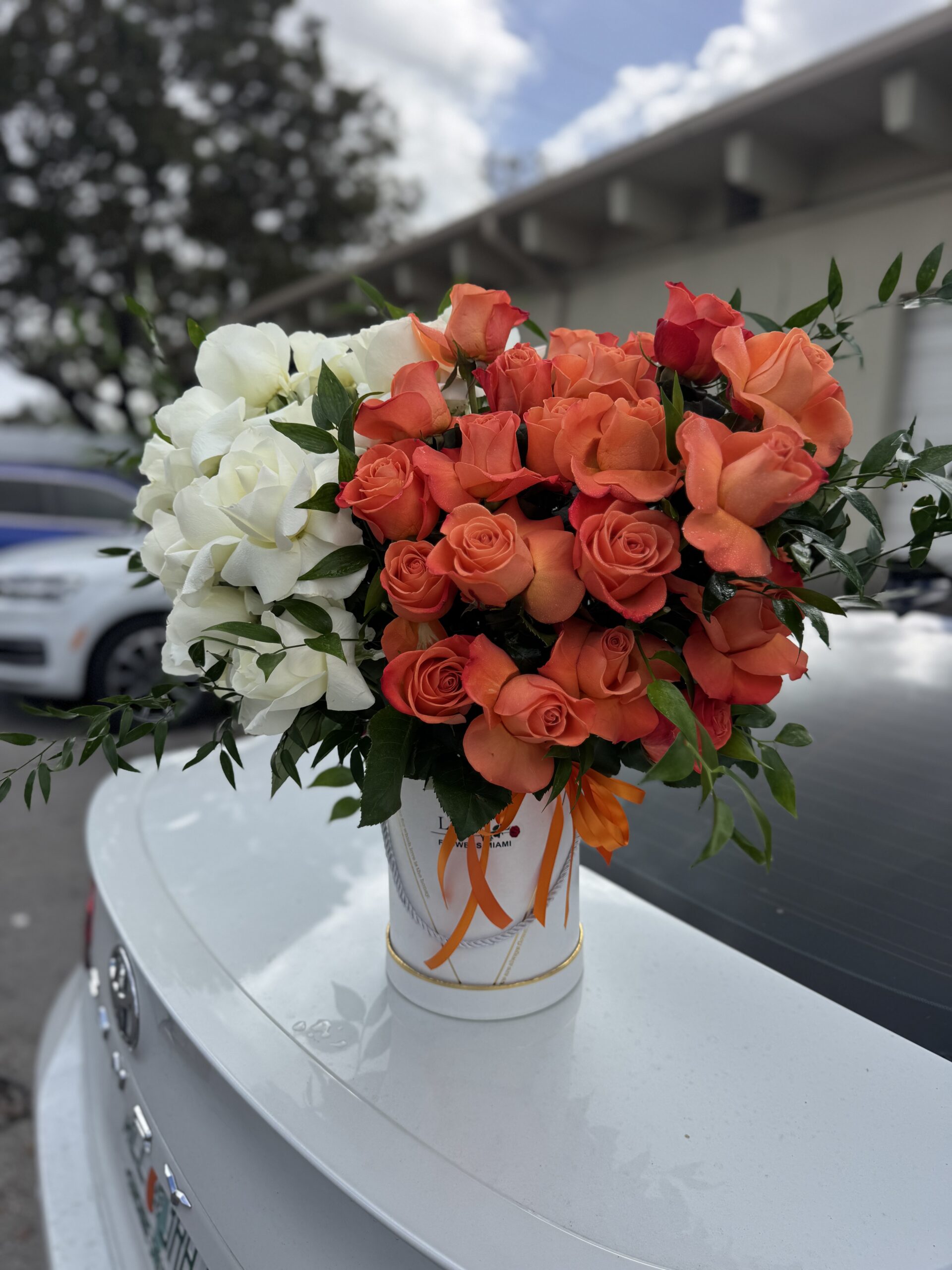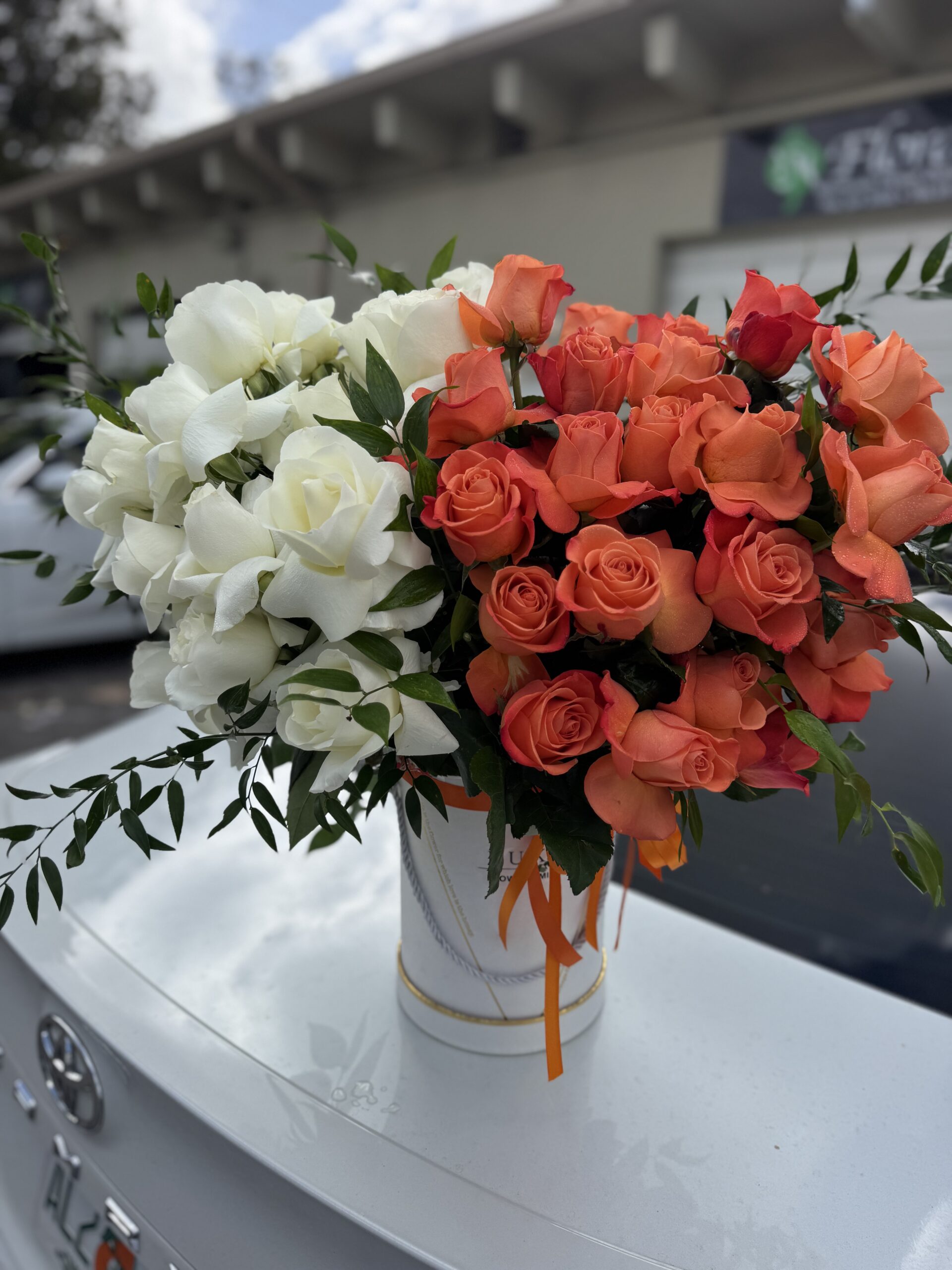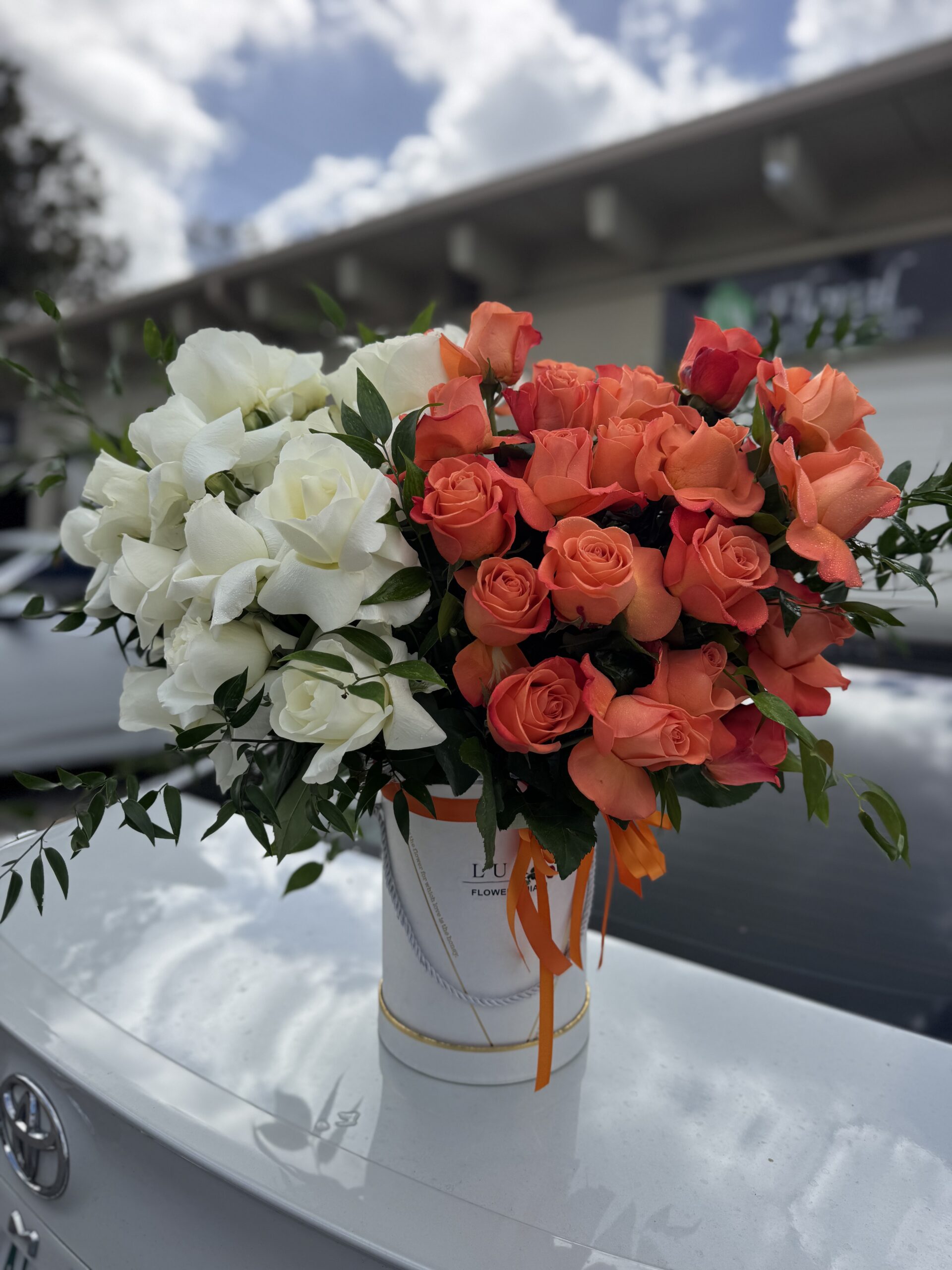 Coral Sunset, an arrangement consisting of 25 white roses and 25 orange roses. It comes in a box; the color may vary.