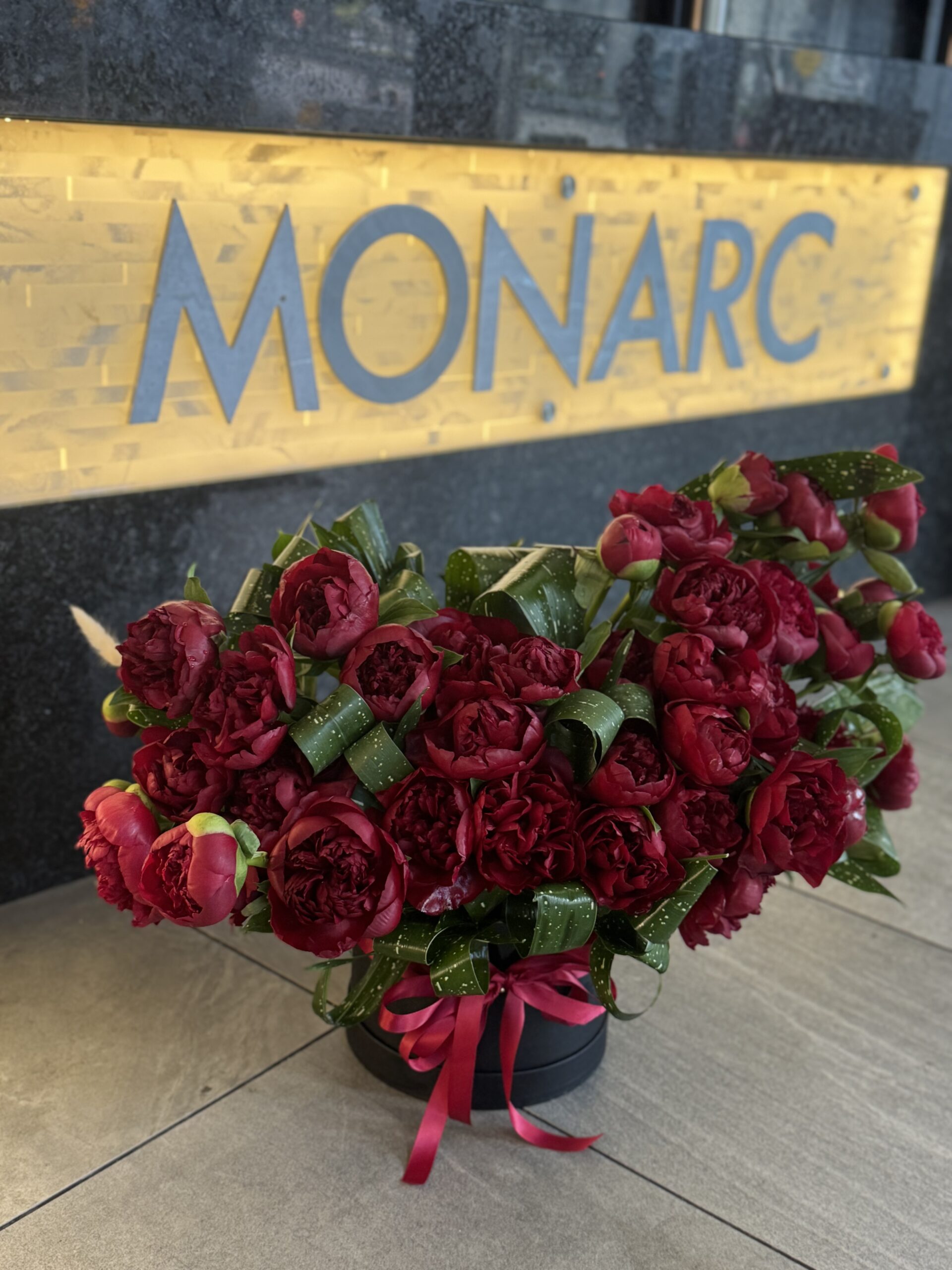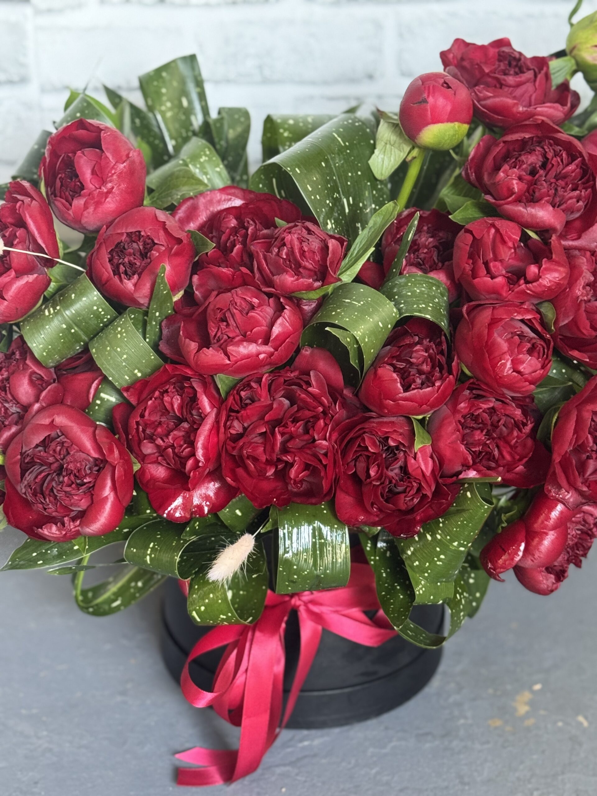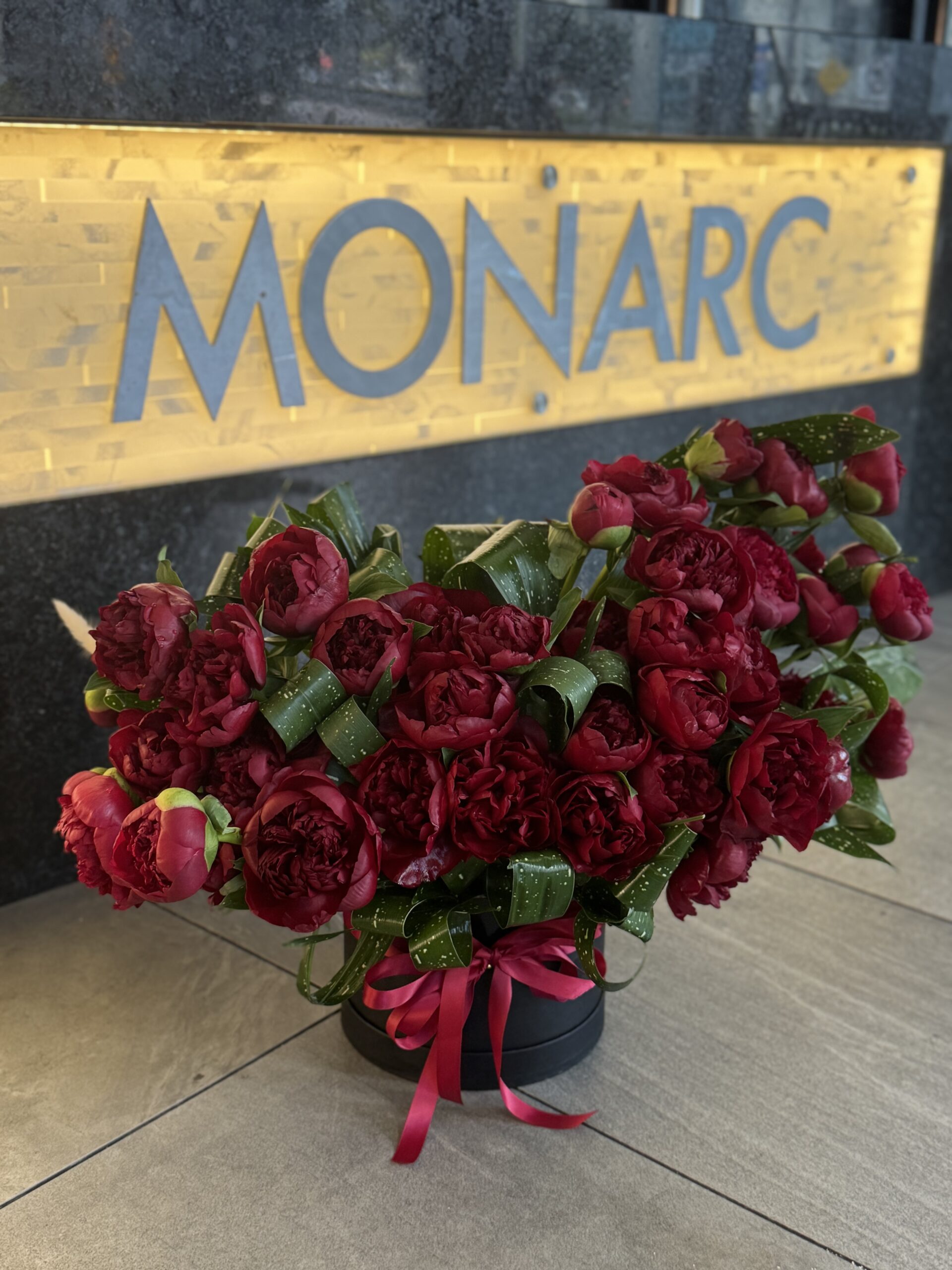 Elegant arrangement of 40 peonies in a box. The color of the box may vary, as may the color of the peony, according to customer preference and store availability.