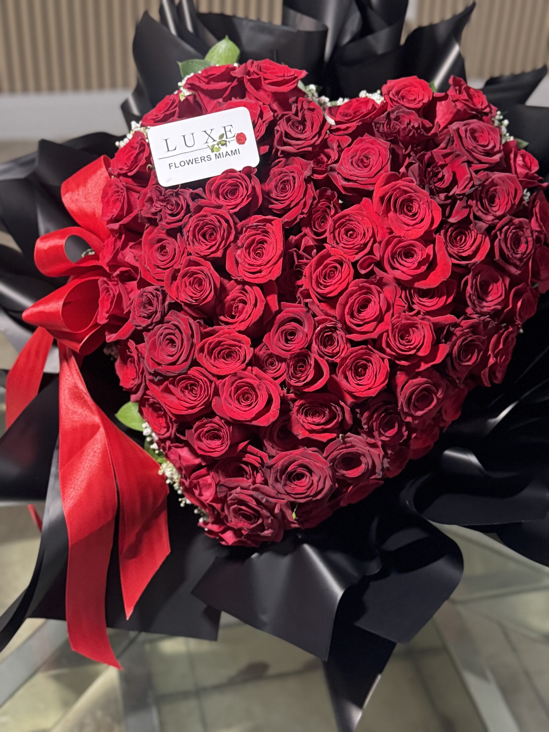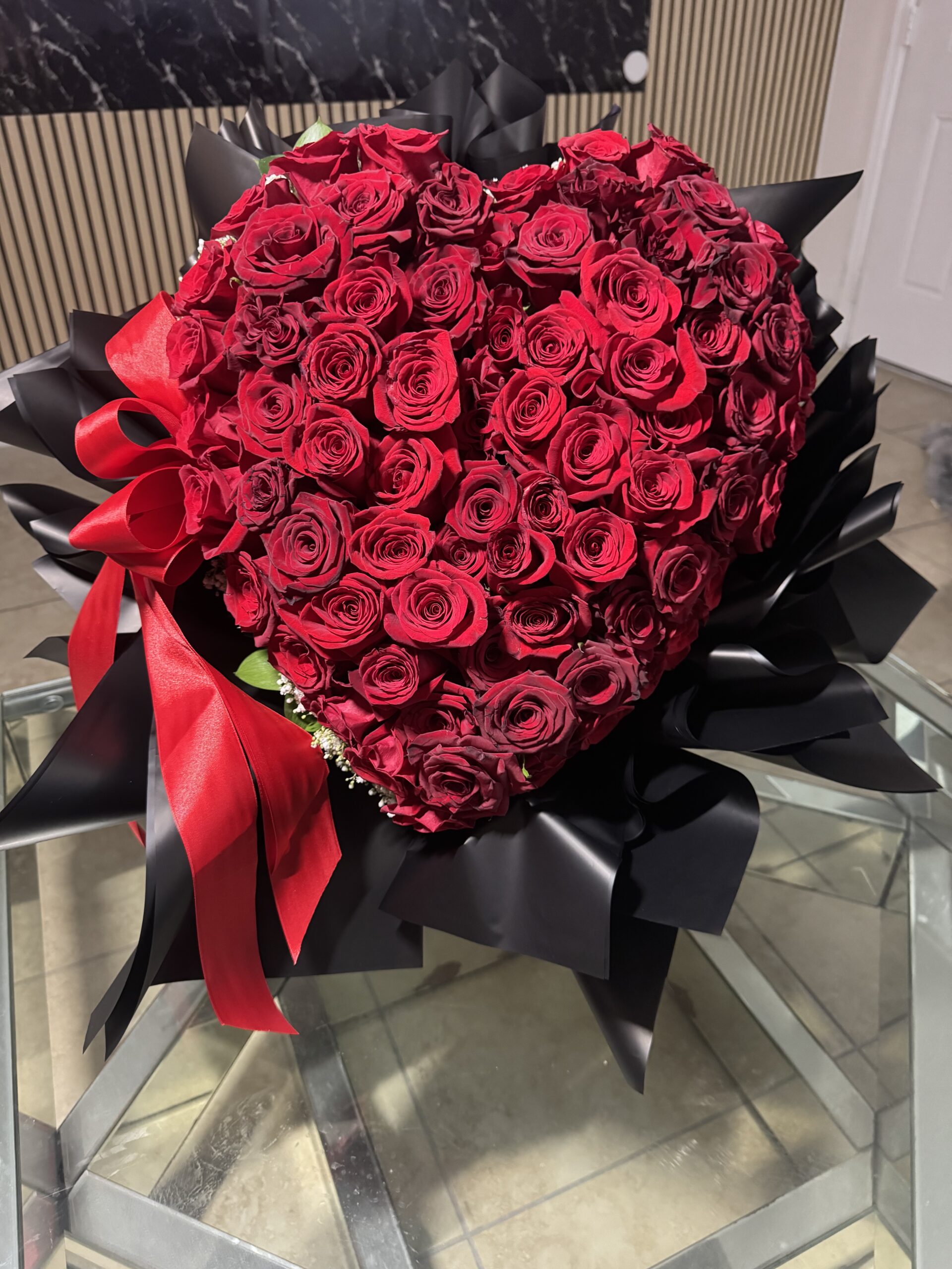 I love you forever. This is a heart-shaped arrangement in a box with 75 red roses.