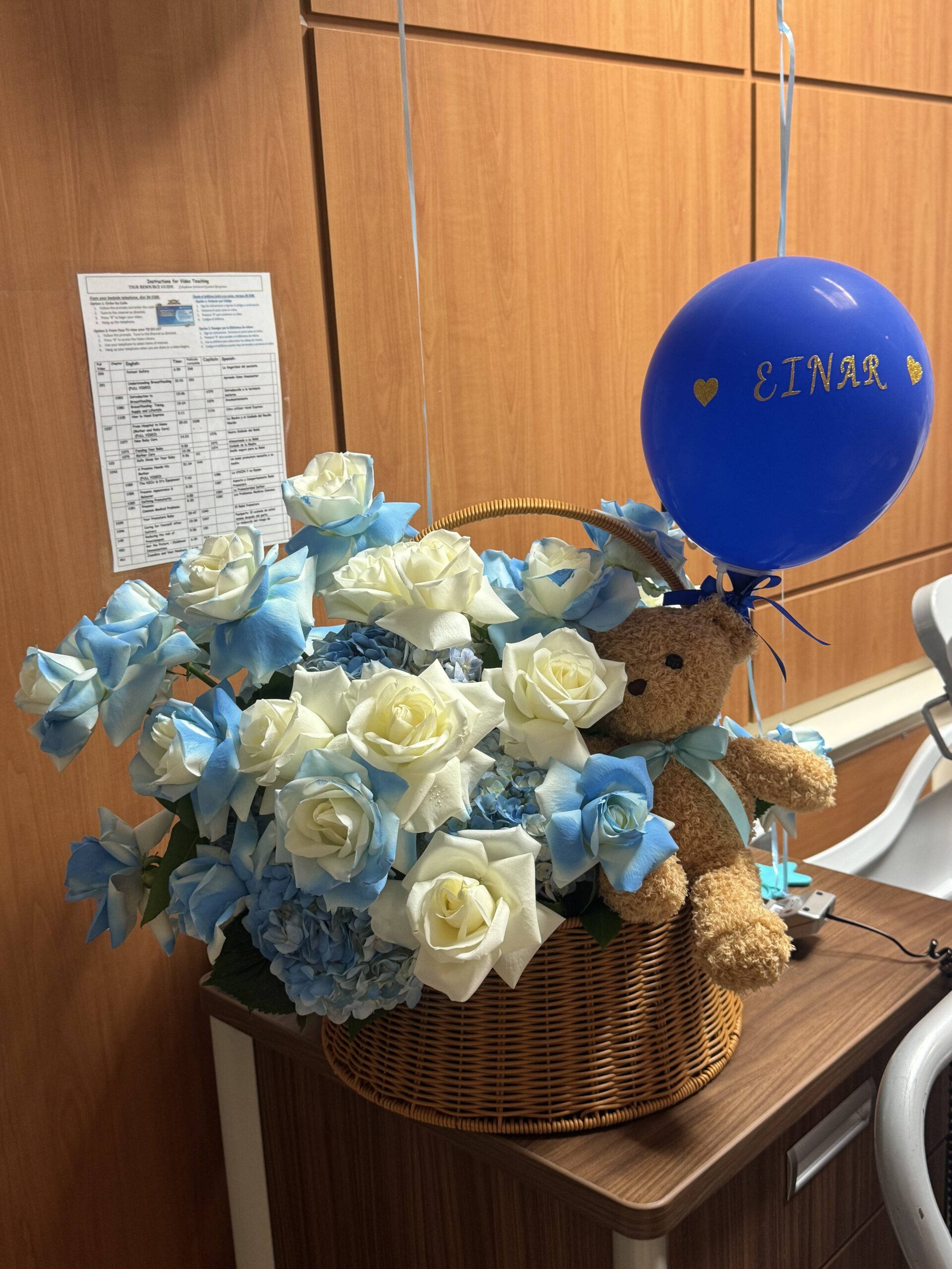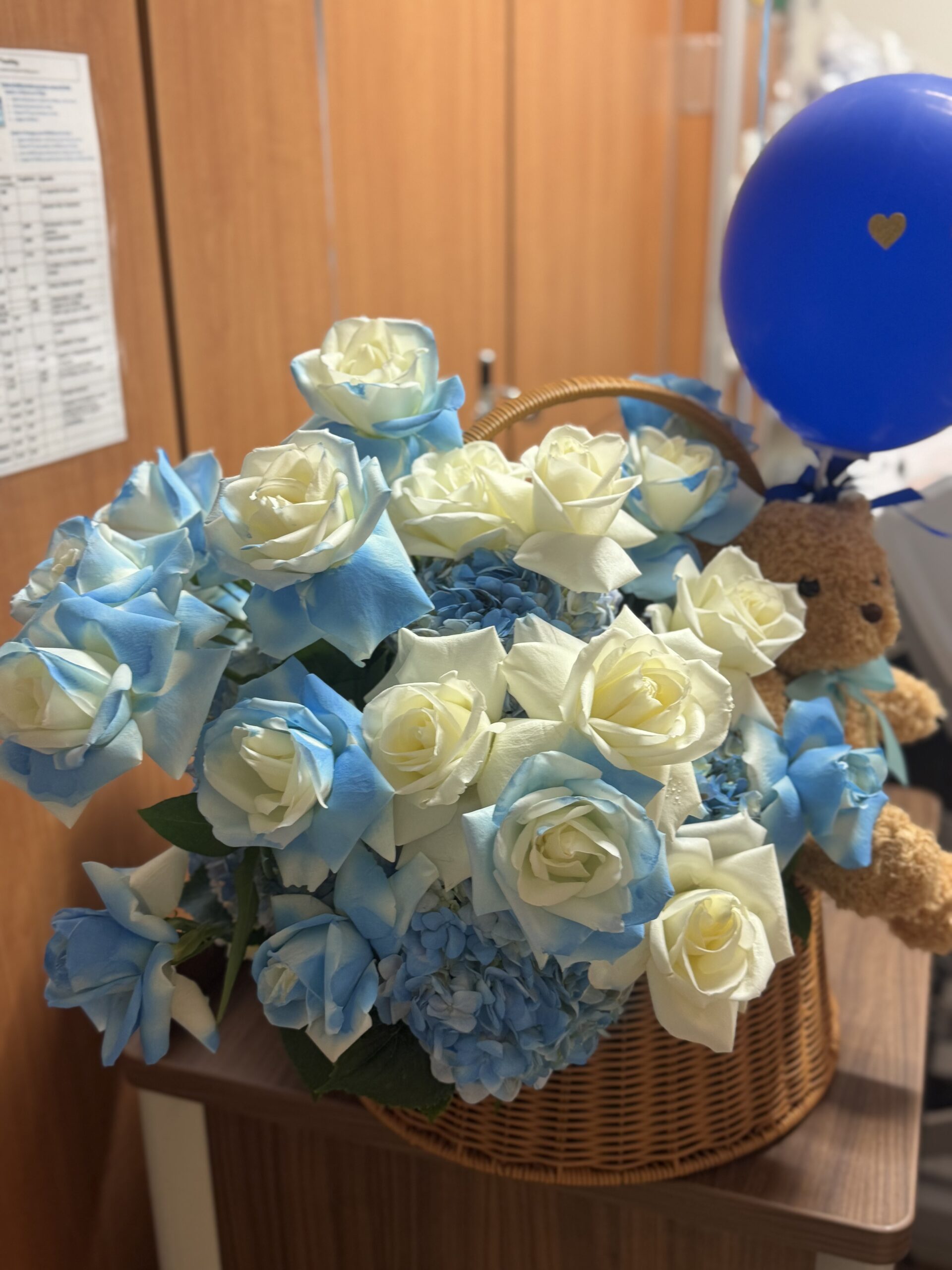 Basket of white and blue roses, hydrangeas and a small plush toy.