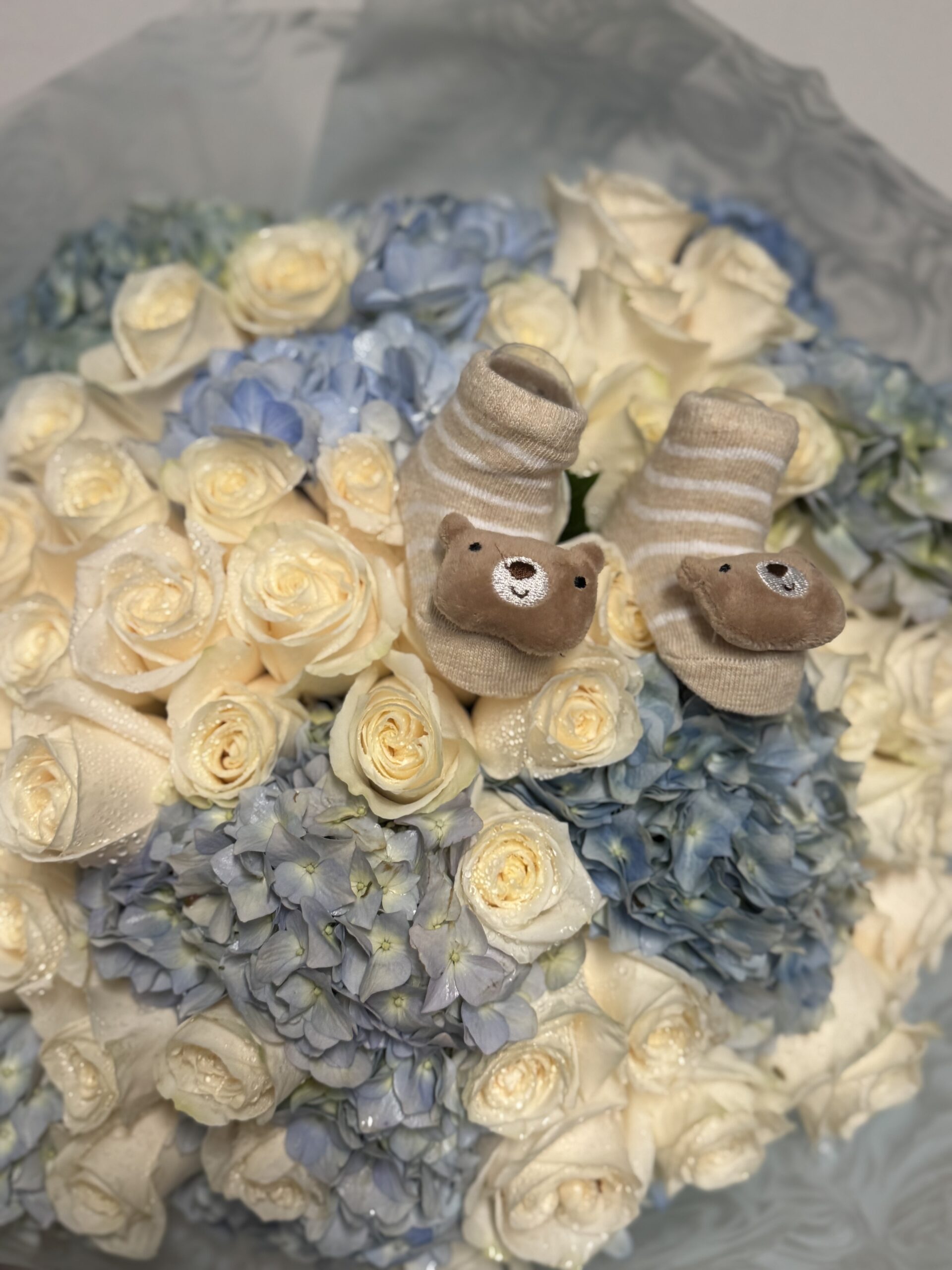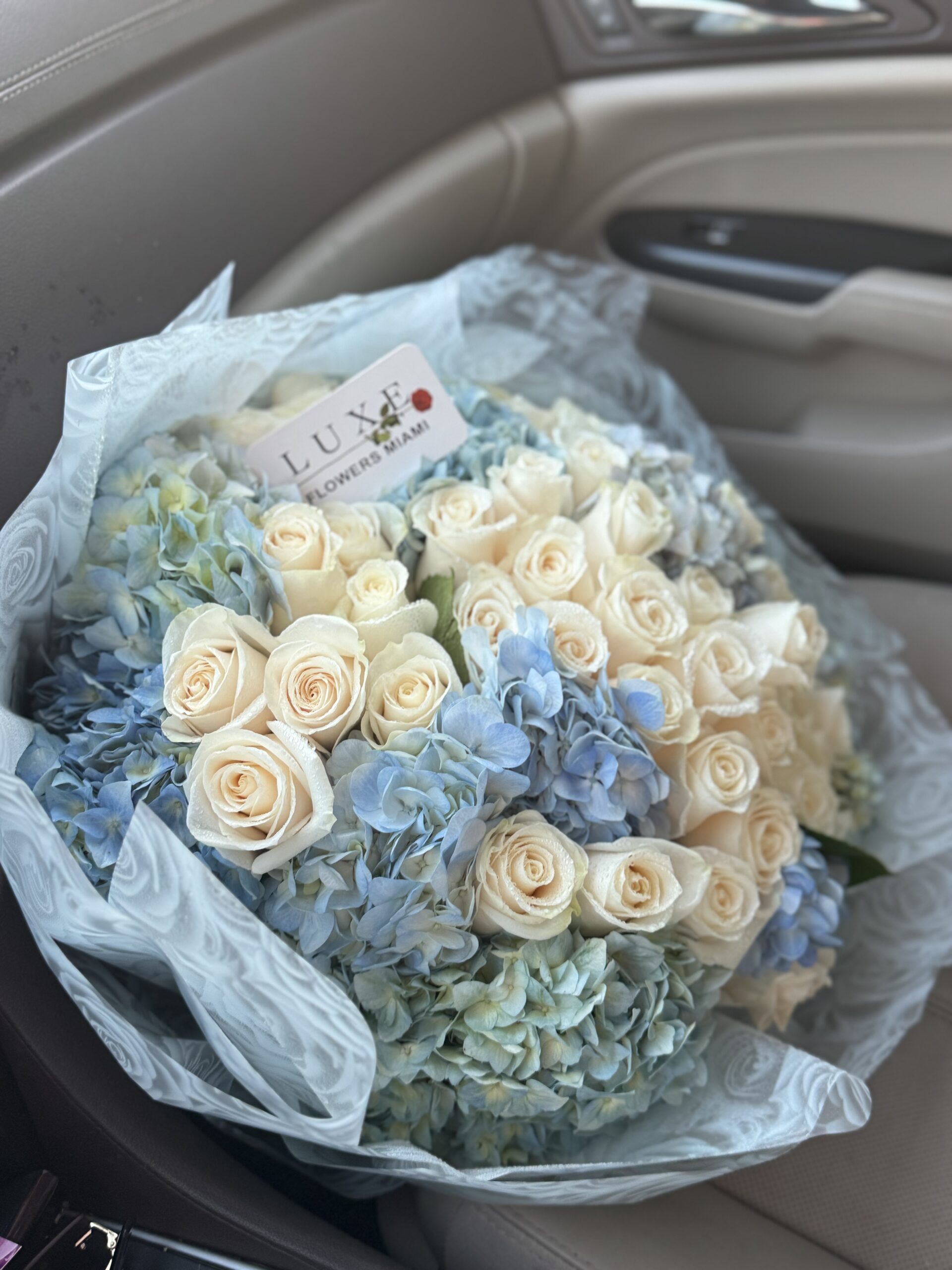 Bouquet of 40 white roses, blue hydrangeas, and decorative shoes. Wrapped in blue paper
