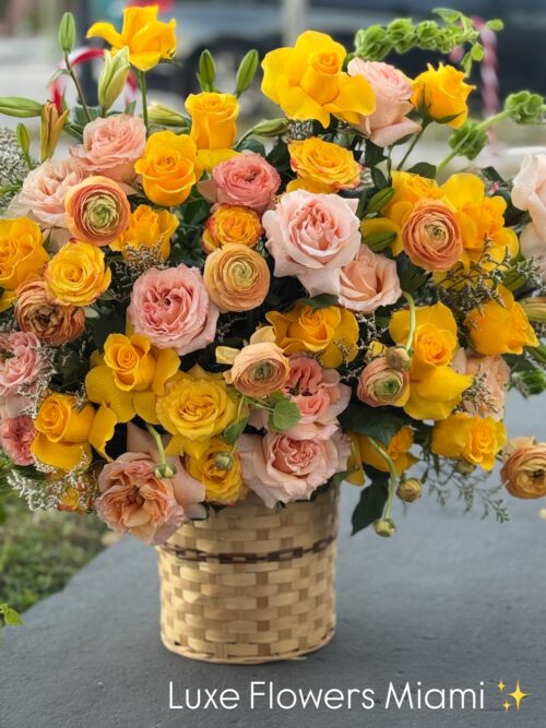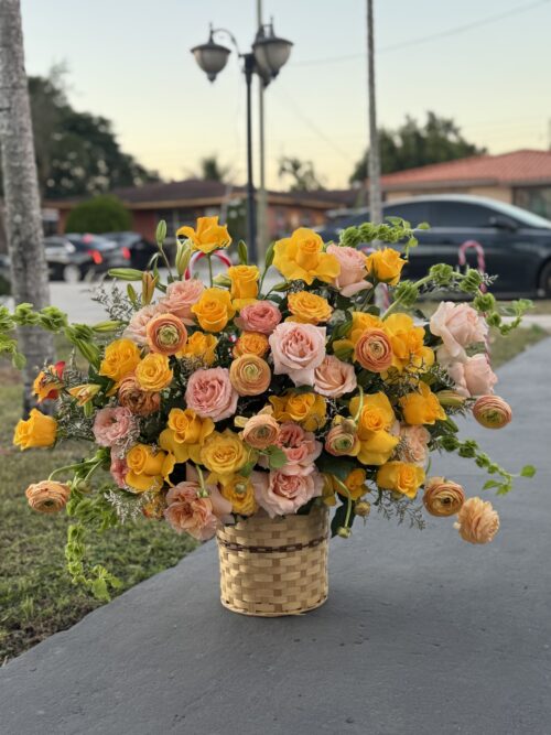 $330.00Original price was: $330.00.$290.00Current price is: $290.00.Basket arrangement with yellow roses, peach, ranunculus, bells of Ireland and blue limonium -