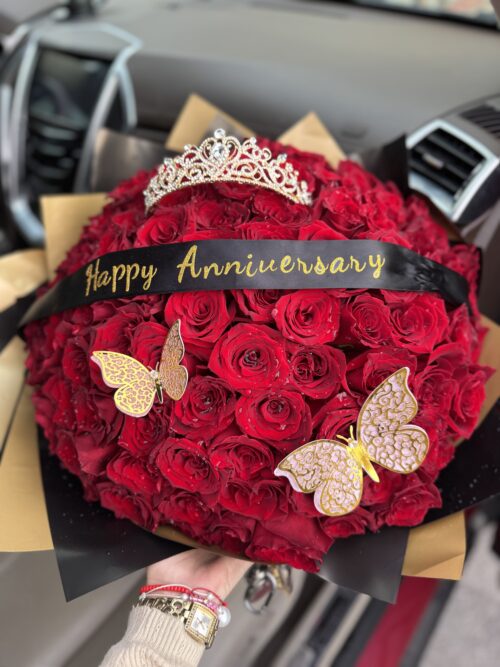 $300.00Original price was: $300.00.$280.00Current price is: $280.00.Bouquet of 100 red roses, with happy anniversary ribbon, decorative butterflies and cellophane paper -
