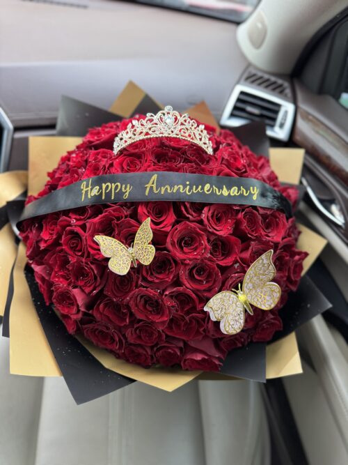 $300.00Original price was: $300.00.$270.00Current price is: $270.00.Happy Anniversary Bouquet of 100 red roses with a decorative wreath and cellophane paper -