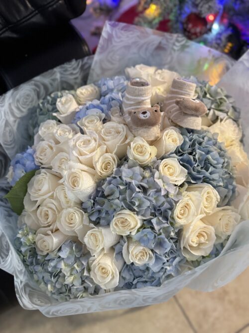 Bouquet of 40 white roses, blue hydrangeas, and decorative shoes. Wrapped in blue paper