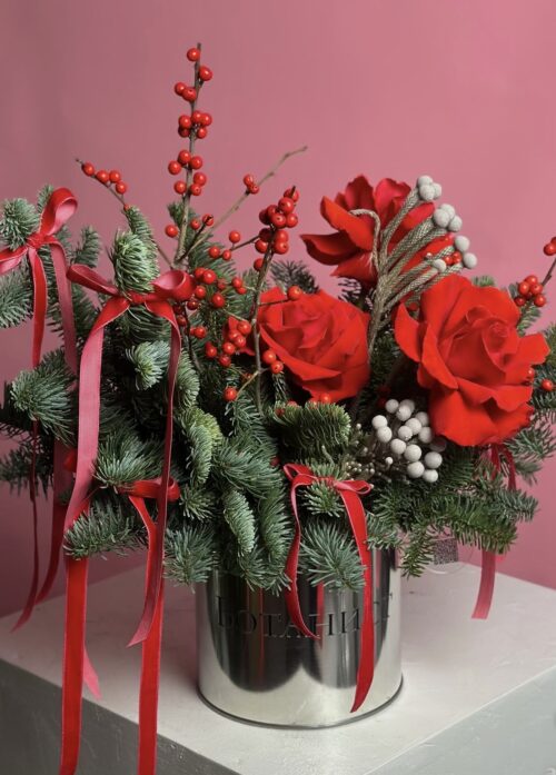 Basket of white and blue roses, hydrangeas and a small plush toy.